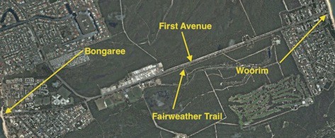 Fairweather Trail is a shared walking and bicycle trail parallel to First Avenue on Bribie Island. It extends from Lions Park at Woorim to Fairweather Park at Bongaree. A footpath leads from Fairweather Park to the Bongaree Jetty. See the satellite photo below for details.